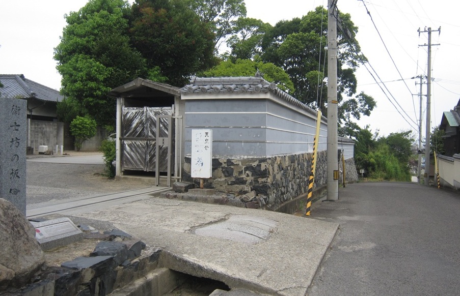 幽閉した上皇を監視するために「衛士」が海岸沿いの道(砂浜)からここに上がった「衛士坊の坂」と名が付く坂道が天皇寺の塀沿いに残っています。天皇寺の場所が衛士詰所の「坊」の跡だと伝承されています。